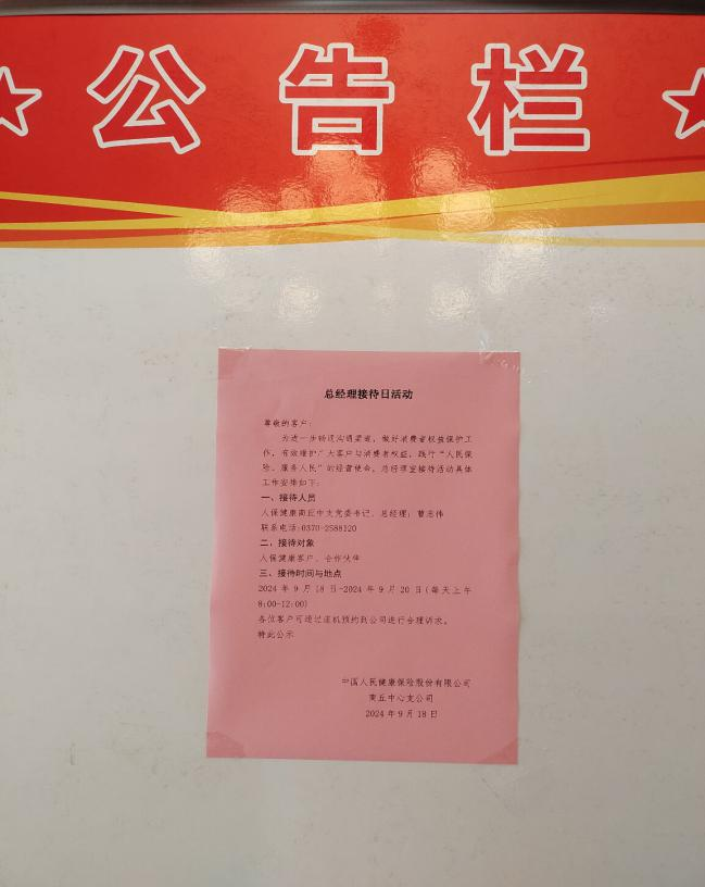 在2024年“金融教育宣传月”期间,人保健康商丘中支以“金融为民谱新篇 守护权益防风险”为主题,为提升客户体验,进一步拓宽客户反馈心声的渠道,能直接面对面进行沟通,并快速解决问题,根据“金融教育宣传月”活动工作安排,人保健康商丘中支在2024年9月18日-9月20日开展了“总经理接待日活动”。