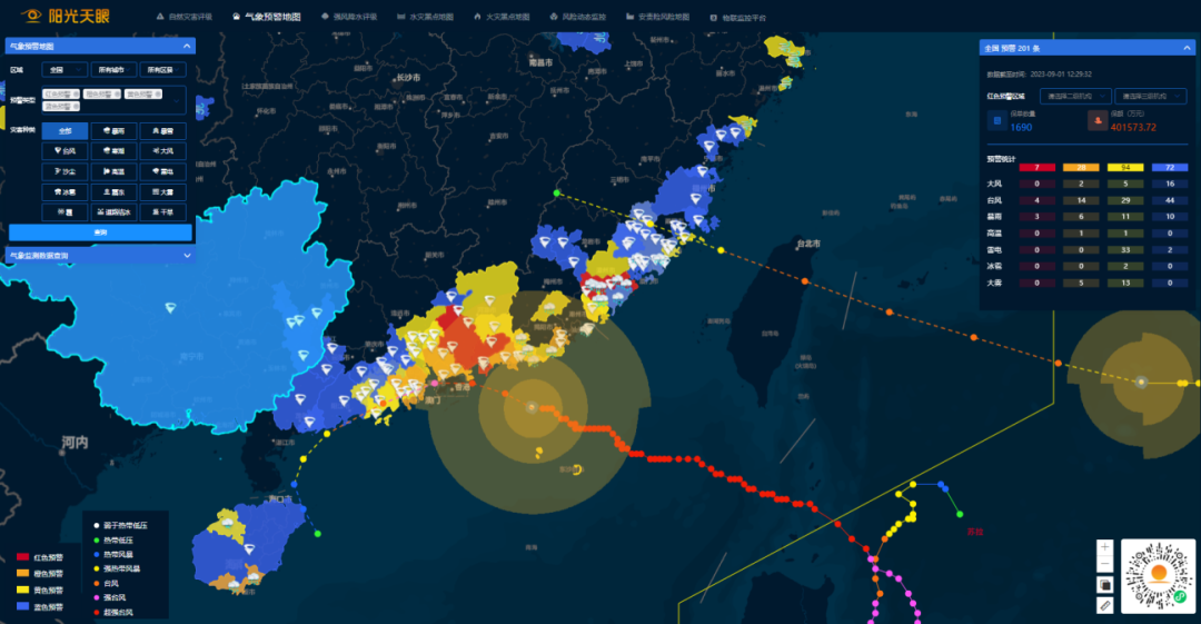 阳光财险推出基于位置智能、大数据技术的风险管理系统——“阳光天眼风险地图平台”,融合灾害、地理、气象、保险等多学科,以暴雨、台风、地震、洪水、雪灾、大风、冰雹、雷电、风暴潮等九种常见气象灾害为研究范围,建立风险评估模型,实现客户自动化线上化评估自然灾害风险与强风降水的功能。平台集成全国布设的物联网设备运行数据,通过中央监控大屏实时监测运行状态,并在设备发生预警时及时向企业安全负责人和阳光财险的风控工程师同步发送信息,实现企业的风险监控、快速预警和及时处置。