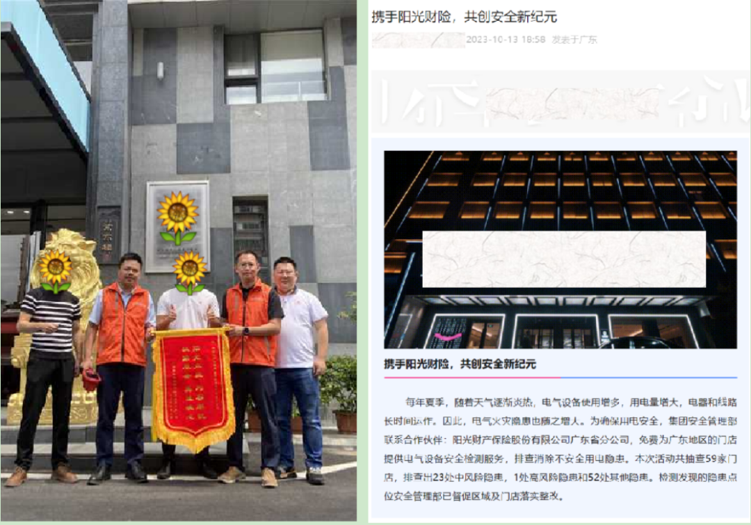 例如在酒店领域,阳光财险针对广东某大型酒店集团风险需求、管理痛点,提供行业级的风险管理服务方案,并组织总分风险工程师团队落实。在5-7月,为该集团所属59家酒店提供风险查勘服务,消除各类风险隐患76个。该酒店客户对阳光财险的风险管理服务成效高度认可,不仅赠送锦旗表示感谢,还在官微就本次服务发表专文,向旗下分布全国的2000多家酒店进行宣传,表达了进一步扩大防灾减损合作的强烈意愿。