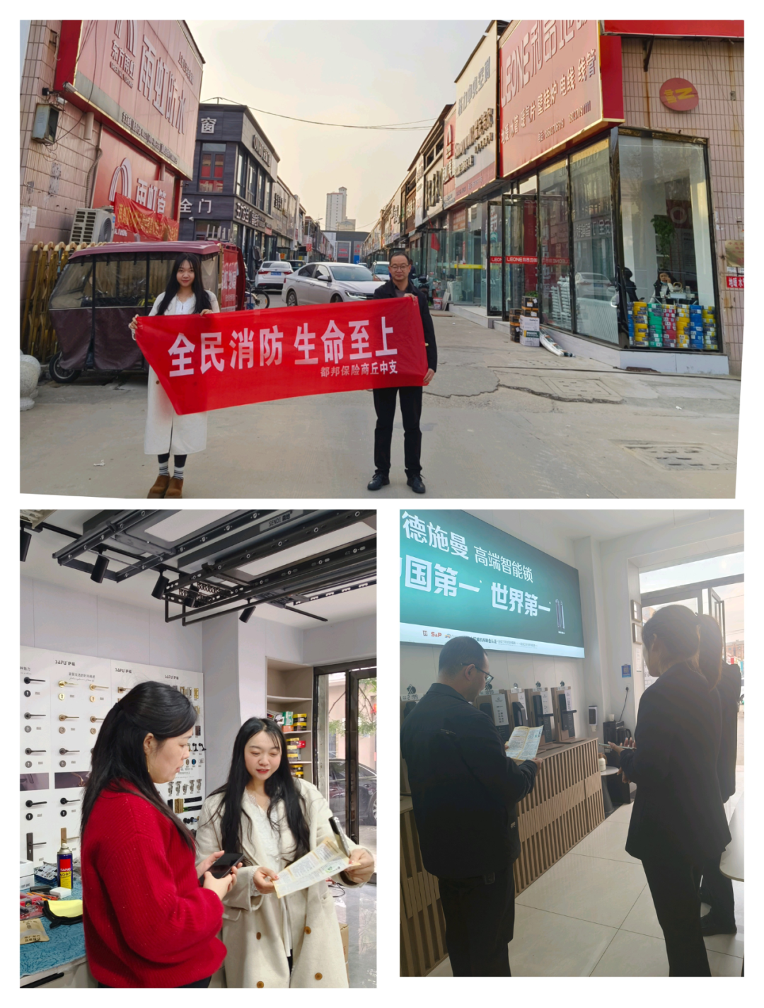 为切实做好“河南省119消防宣传月”宣传工作,不断提升全民消防安全素质和社会抵御灾害能力,都邦财险商丘中支公司于11月22日积极组织员工走进商丘市中意建材市场开展了“全民消防 生命至上”为主题的宣传活动。宣传期间,工作人员通过悬挂条幅、发放宣传折页对过往的群众普及消防安全知识,发放宣传安全手册,让广大社会群众了解高层住宅也是火灾的多发场所,家庭是社会的最小单元,每个人都有必要提高安全意识、防范火灾风险,楼道乱堆杂物、电动自行车进楼、管道井存放可燃物、设置影响灭火救援和疏散逃生的防盗窗防护网等障碍物的畅通,提高居民的安全防范意识,关爱生命,珍爱生命。