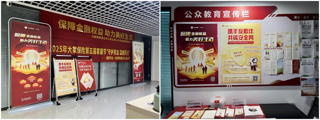 大家财险河南分公司商丘中心支公司充分发挥营业网点阵地宣传作用,组织本级及各县区机构在职场内部张贴宣传海报、悬挂“保障金融权益 助力美好生活”的主题条幅,统一设置设置金融知识教育宣传区、宣传栏,更新各营业网点金融教育公众宣传栏内容,充实公益宣传材料,向前往网点办理业务的消费者普及各类金融产品基础知识。在前台柜面设置老年人专属服务台、暖心驿站,更新完善休息座椅、免费饮用水、急救药箱、老花镜、充电设备、微波炉、打印机等暖心设施,发挥网点优势,为银发老人、城市环卫工人、快递小哥、残障人士等特殊人群提供便利。