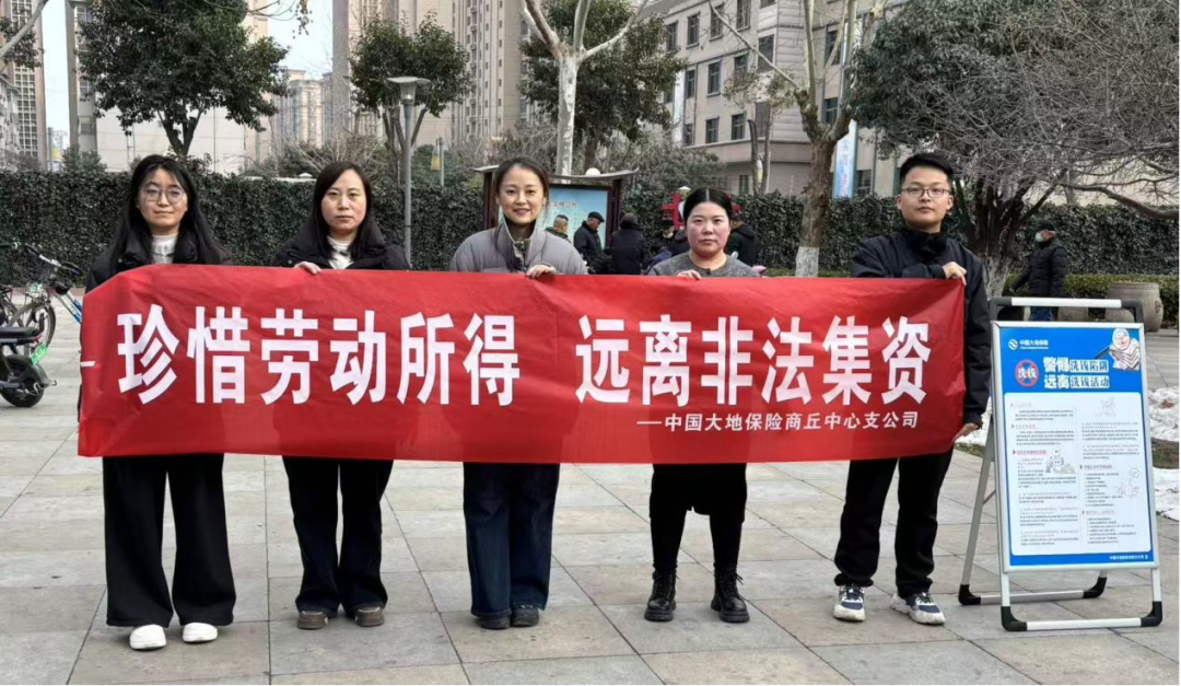 为切实提升群众的防范意识和识别能力,筑牢安全防线,中国大地保险商丘中心支公司于1月29日在“街心公园”开展“岁末年初防范非法集资”宣传活动,本次活动以“珍惜劳动所得 远离非法集资”为口号,切实提升公众的金融风险防范意识,让更多的人能够识别并远离非法集资活动。
