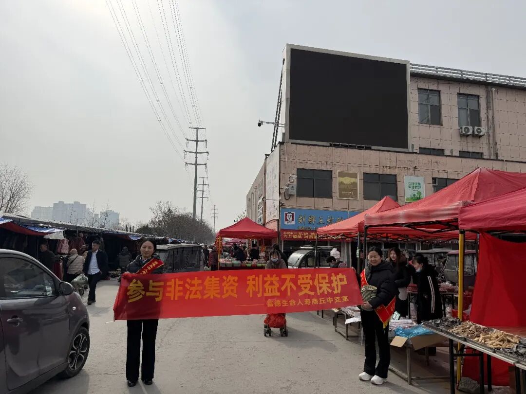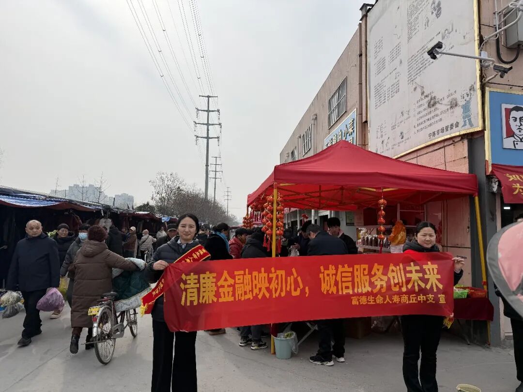 2026年2月,正值岁末年初资金流动频繁之际,为切实提升社会公众的金融风险防范意识和能力,维护地方金融秩序稳定,富德生命人寿保险股份有限公司商丘中心支公司积极履行社会责任,组织专业宣传队伍走进商丘市宁陈庄农贸市场,开展了一场以“防范非法金融、远离非法集资、守护资金安全、共筑清廉诚信金融环境”为主题的集中宣教活动,将实用的金融知识送到广大市民和商户身边。