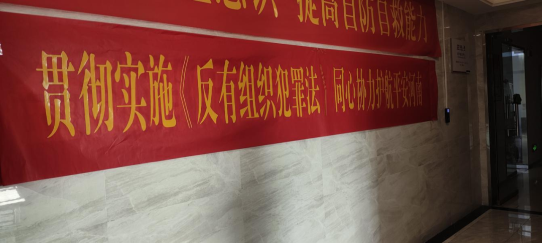 在职场内,悬挂条幅、对来公司办理业务的客户讲解《反有组织犯罪法》等相关知识,营造浓厚的宣传氛围。