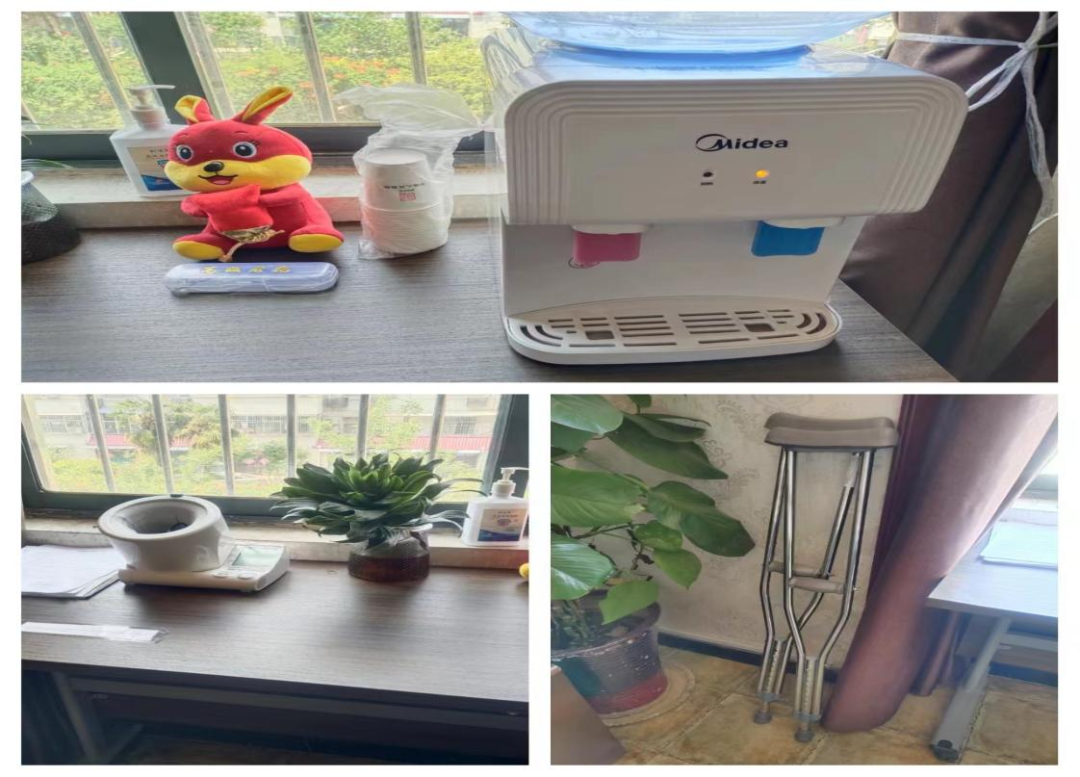 在职场内放置血压计、拐杖、老花镜、饮水机,为有需要的客户提供服务。