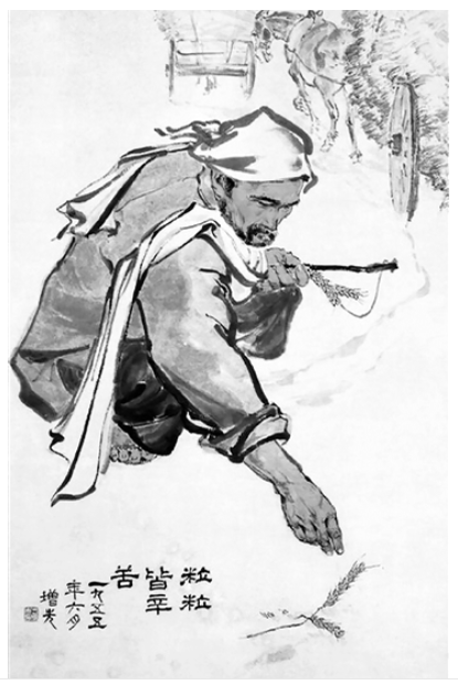 唐朝初期统治者节俭务实,创业兴邦,而唐朝中后期奢靡之风又盛。讴歌节俭、劝诫奢侈于是成为唐诗的一个重要内容。李绅将“盘中餐”的粮食与农民在烈日之下的汗水联系在一起,凝成了“粒粒皆辛苦”的名句;杜甫《往在》里说:“君臣节俭足,朝野欢呼同。中兴似国初,继体如太宗。”白居易则写道:“岁丰仍节俭,时泰更销兵。圣念长如此,何忧不太平。”提出太平之世的“秘诀”在于节俭销兵,即使是在丰收之年,也不能丢弃勤俭之德。
